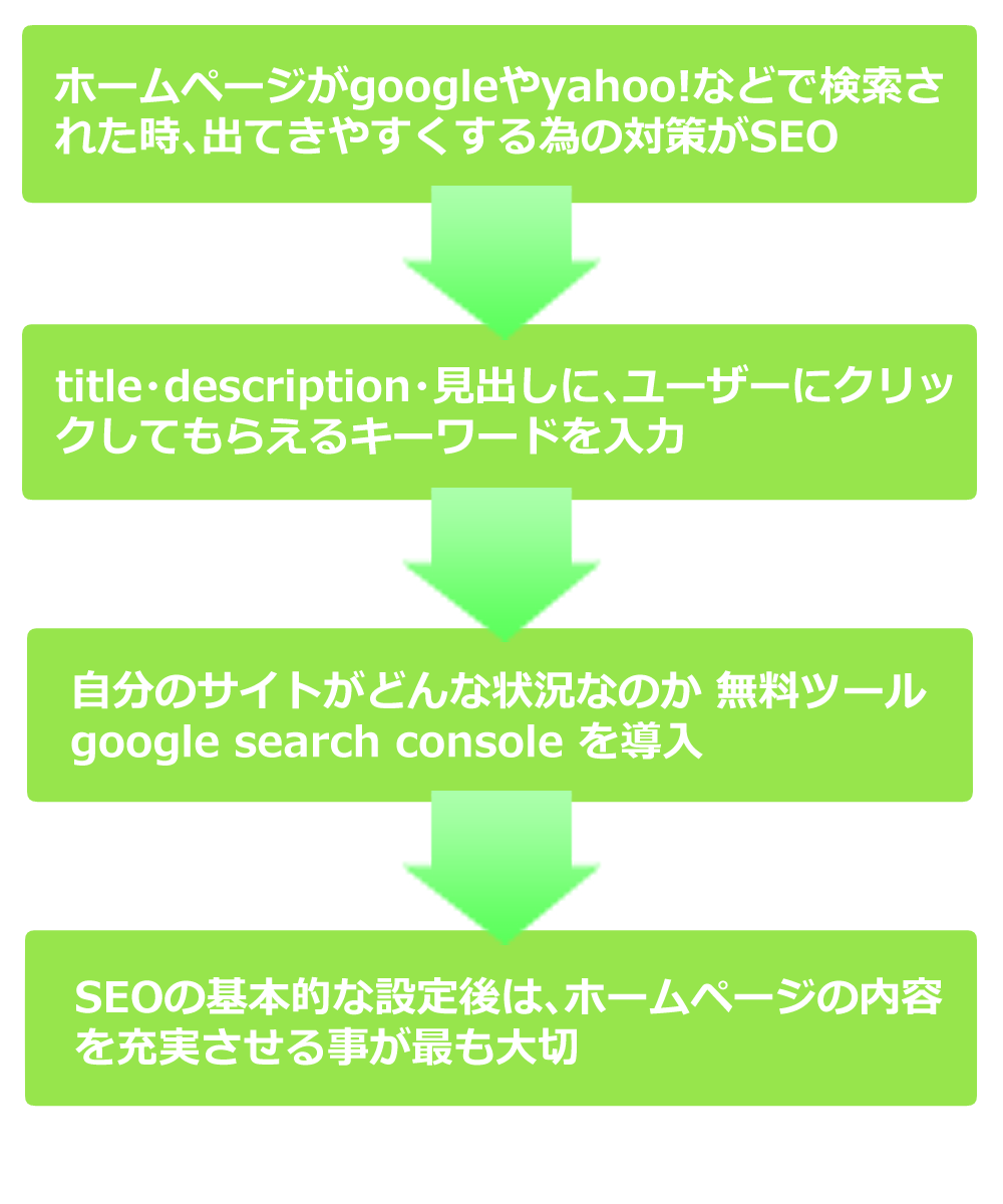 SEO対策とは「Search Engine Optimization」の略称です。わかりやすく言えば、お店など検索する時どのようなキーワードで検索しますか?その検索結果の上の方にホームページが表示されるようにする行為をSEO対策と言います。SEO対策をしていなければ検索結果の上のほうに表示されない場合がほとんどです。SEO対策をきちんとしていればその検索結果の上の方にホームページが表示され『集客につながる』という事です。